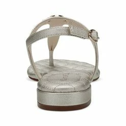 - Almond-toe T-strap slingback thong sandals with adjustable buckle closure