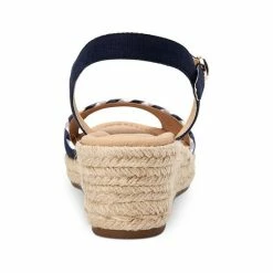 - Round-toe ankle-strap espadrille wedge sandals with adjustable buckle closure