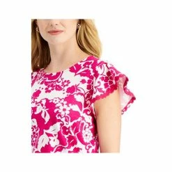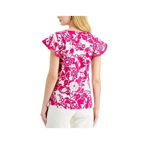 Flounce cap sleeves with crochet trim and a pretty print lend undeniable charm to this petite top from Charter Club.