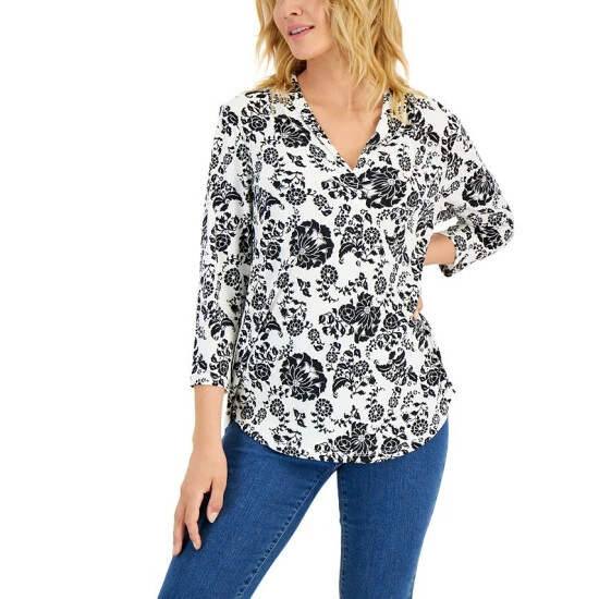 Update your look with a petite popover top from Charter Club, styled with an intricate floral print and flattering 3/4-length sleeves.