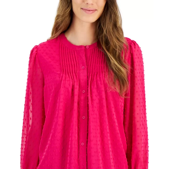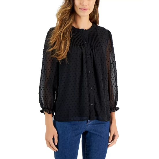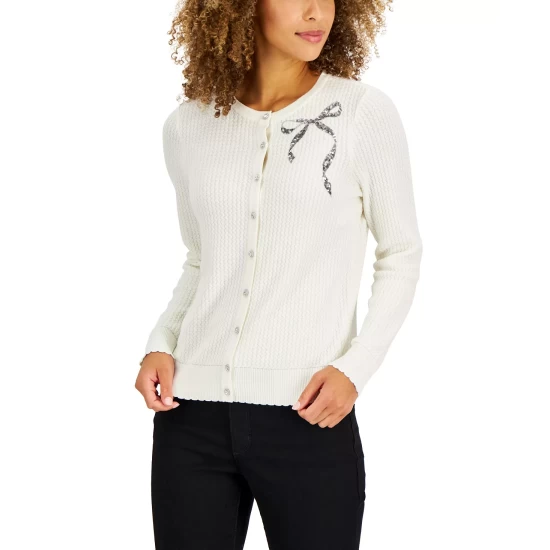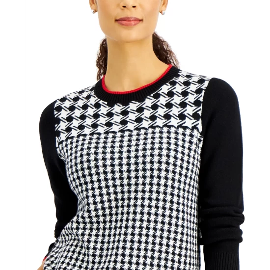 A mix of houndstooth prints lend timeless appeal to this petite crewneck sweater from Charter Club.