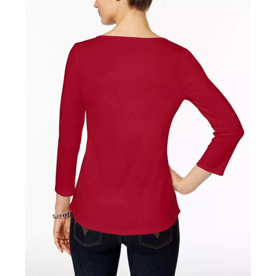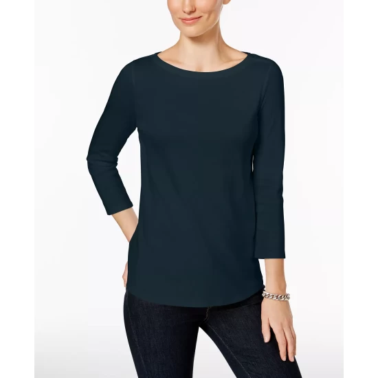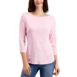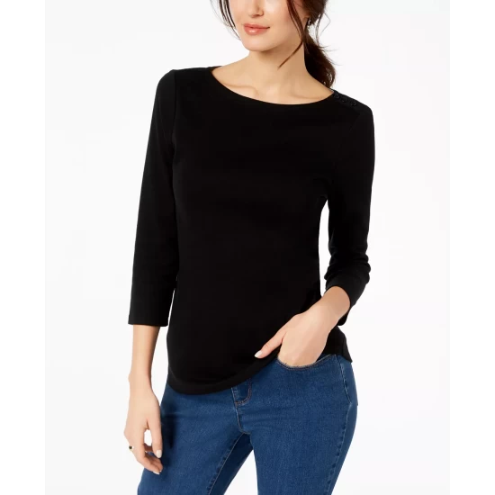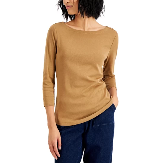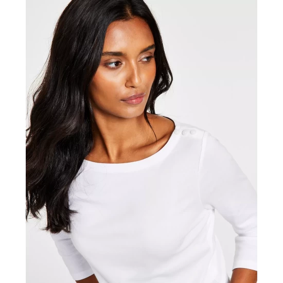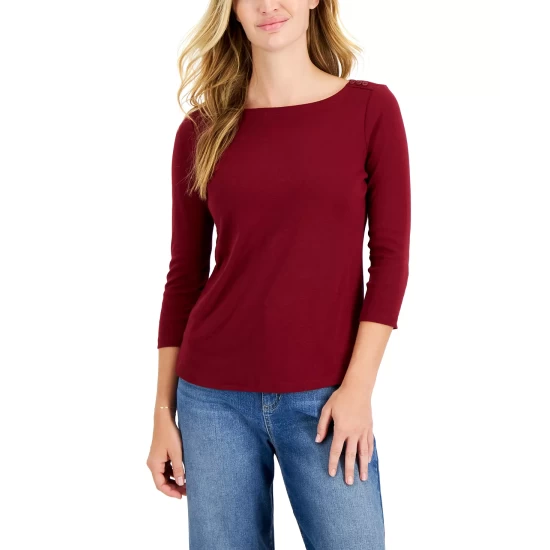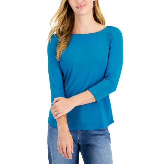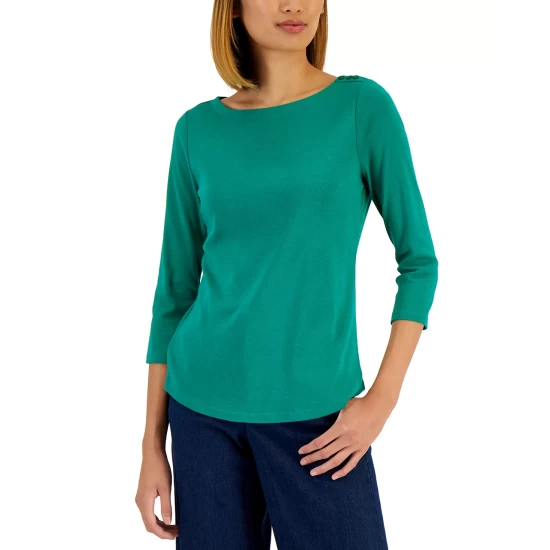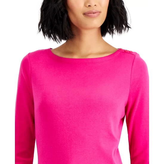 Subtle button details offer a graceful spin on a classic look with this essential petite boat-neck top from Charter Club.