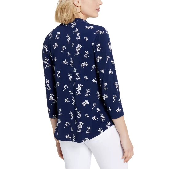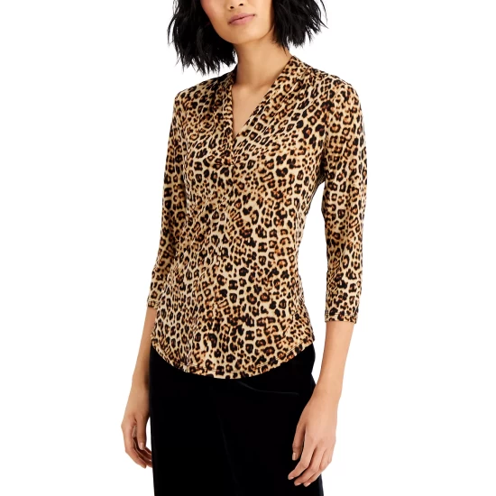 Subtle pleats effortlessly frame the flattering V-neckline of this petite printed top from Charter Club with 3/4-sleeves.