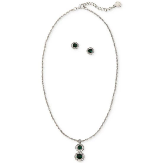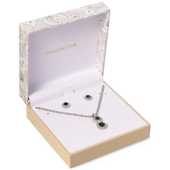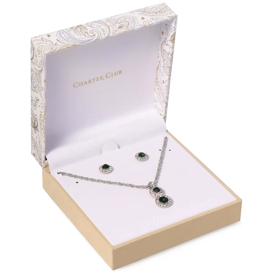 A crystal halo theme is featured throughout this stunning pendant necklace and stud earrings set, already boxed by Charter Club.