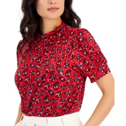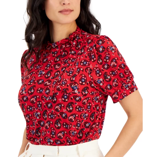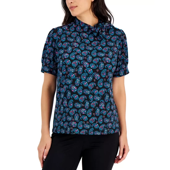 An asymmetrical bow accents a mock neck, polished this vibrant knit top from Charter Company.