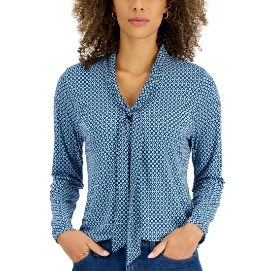 A subtle geometric printed pattern and a tie at the front compliment this blouse by Charter Club.