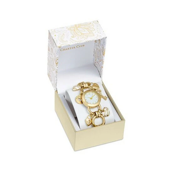 Charter Club presents a key piece for your collection of pretty fashion watches in shiny gold-tone mixed metal and white enamel.