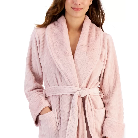 A carved cable texture brings a modern twist to this supersoft wrap robe by Charter Club.